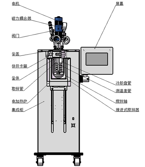 產(chǎn)品功能和特點(diǎn):升降型式,機(jī)電一體化設(shè)計(jì)、結(jié)構(gòu)緊湊;框架支撐結(jié)構(gòu),配腳輪方便移動;主體可快開設(shè)計(jì),開閉釜操作方便、快捷;升降輔助機(jī)構(gòu)方便操作,手動/電動可選;高扭矩磁力傳動,配優(yōu)選電機(jī),提升運(yùn)行穩(wěn)定性;攪拌支持定制槳葉類型,適配多樣化攪拌需求;加熱爐傳熱快,均熱效果好,效率可調(diào);真彩色觸控屏,模塊化顯示,控制界面操作簡潔;支持遠(yuǎn)程控制,具備RS485通訊口,配上位機(jī)軟件;可顯示工作時(shí)間/溫度/轉(zhuǎn)速/壓力,PID自整定控溫精準(zhǔn);具備安全連鎖功能,超溫超壓報(bào)警;具備數(shù)據(jù)采集,記錄以及報(bào)表導(dǎo)出功能;支持選配加料、計(jì)量、取樣、冷凝等擴(kuò)展功能。